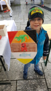 In der Sonnenscheune angekommen, geht es auch gleich schon los. Wir erklären den Kindern welches Holz und welches Werkzeug wir zum Aussägen der Spielzeugwaffen brauchen. Mit der Laubsäge wird gesägt, mit Feile und Schleifpapier wird geschliffen. Die Arbeit ist für manche Kinder relativ anspruchsvoll, trotzdem aber mit unserer Hilfe für jedes Kind schaffbar. Die Eltern sind natürlich herzlich eingeladen, die Kinder beim Bauen der Schwerter, etc. zu unterstützen (ist aber keine Bedingung). Die Griffe werden genagelt und mit bunten Bändern ummantelt. Dann wird alles angemalt. Fertig sind tolle Schwerter, Schilde, Äxte, etc..
